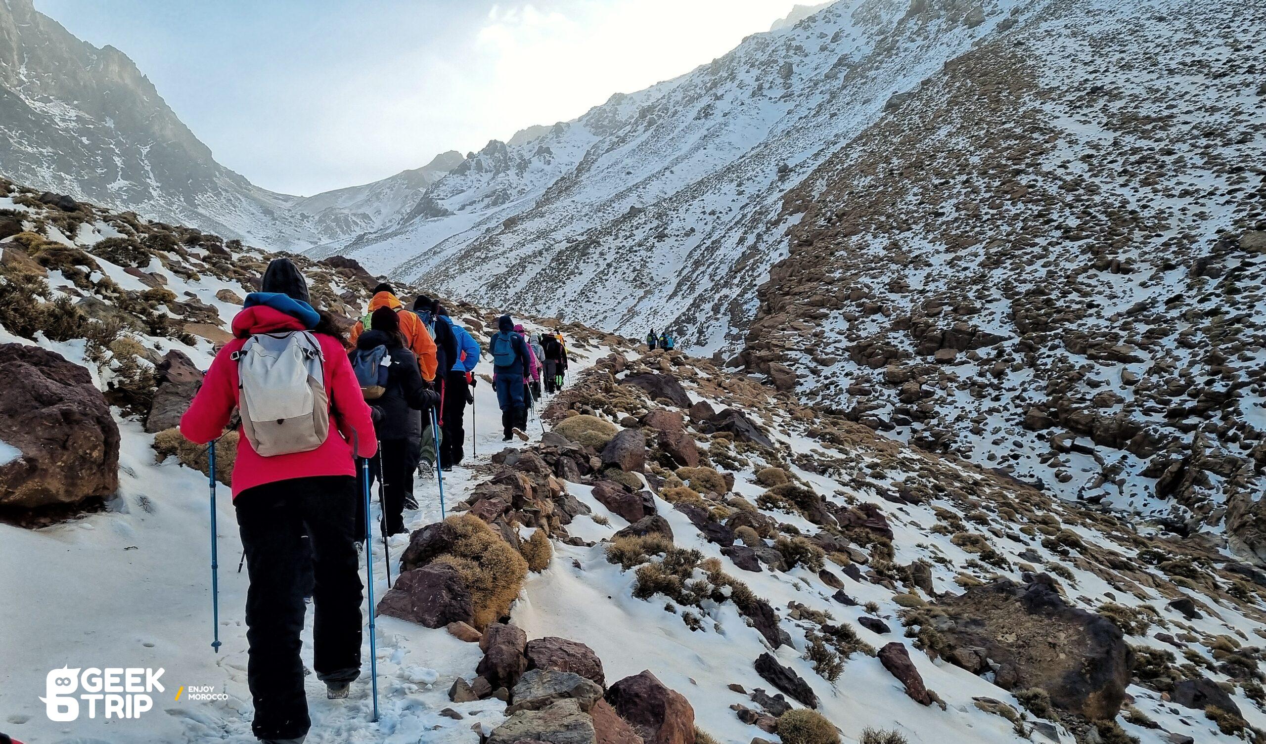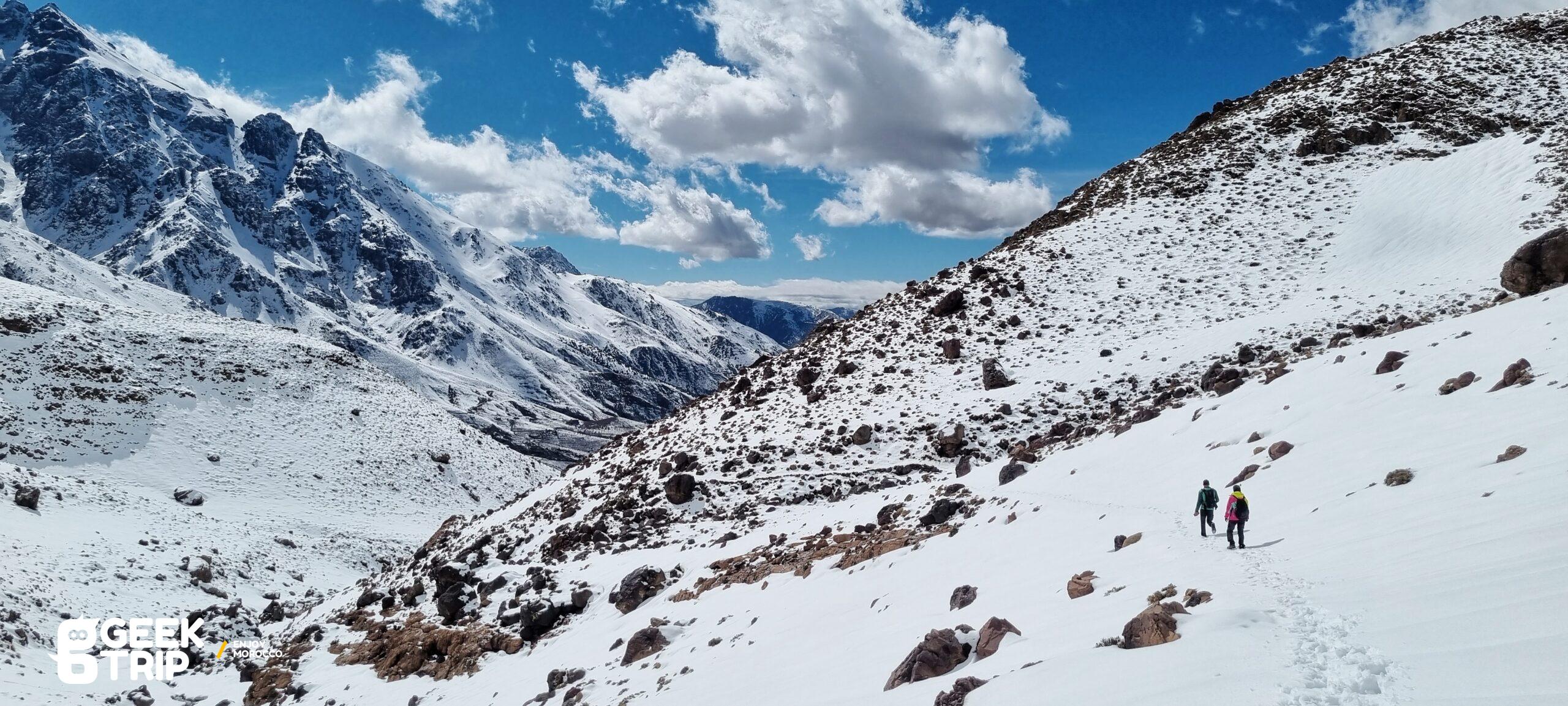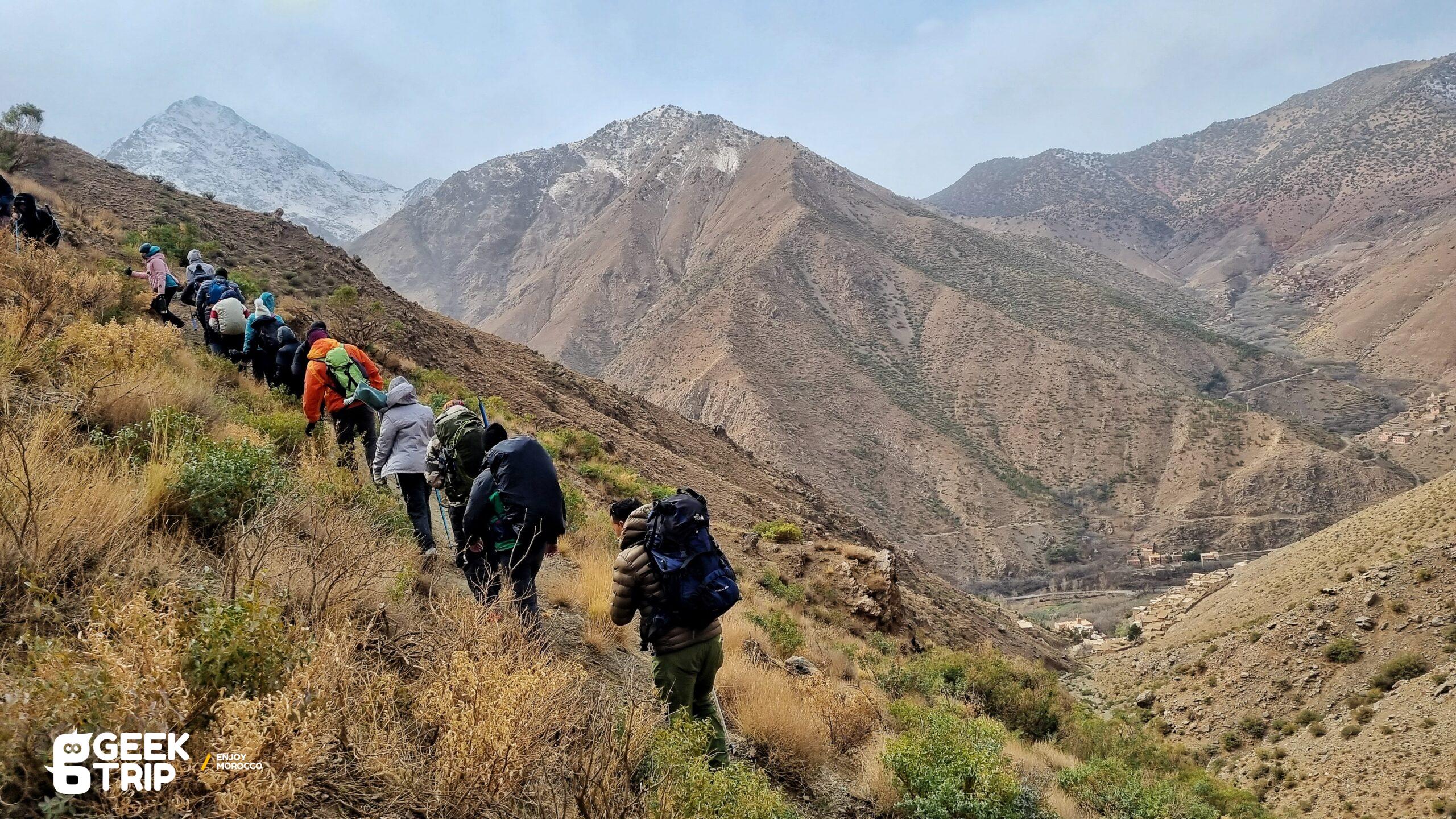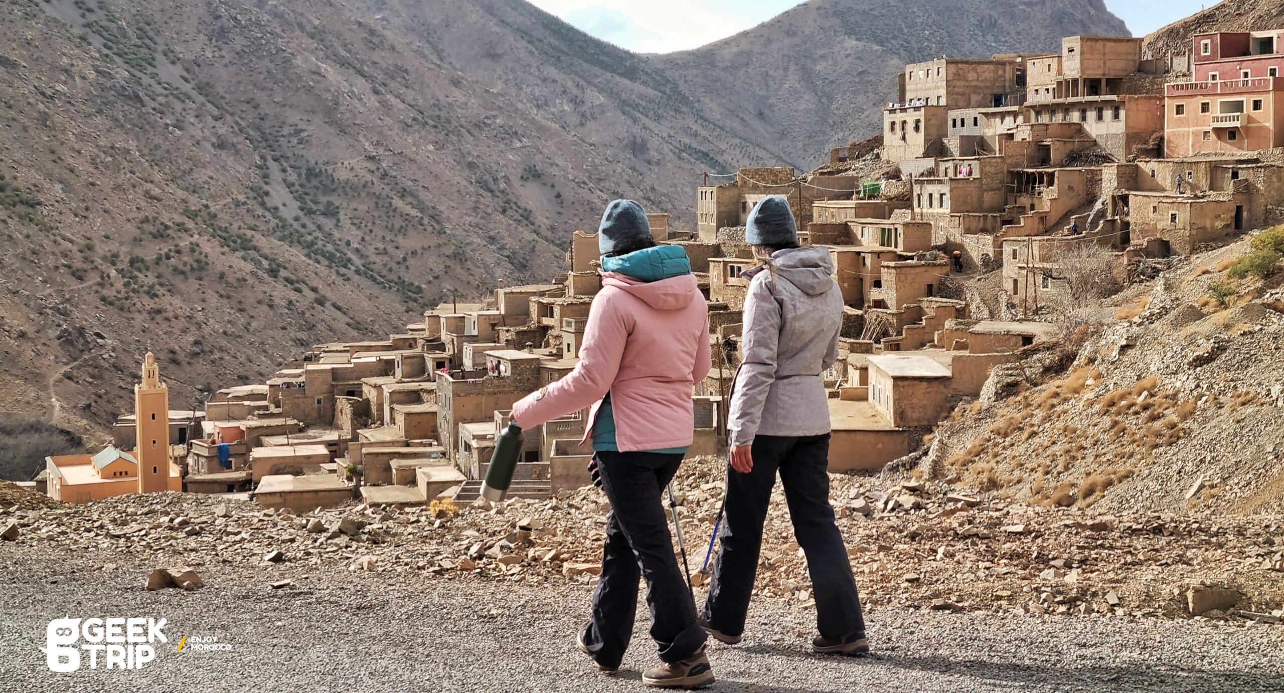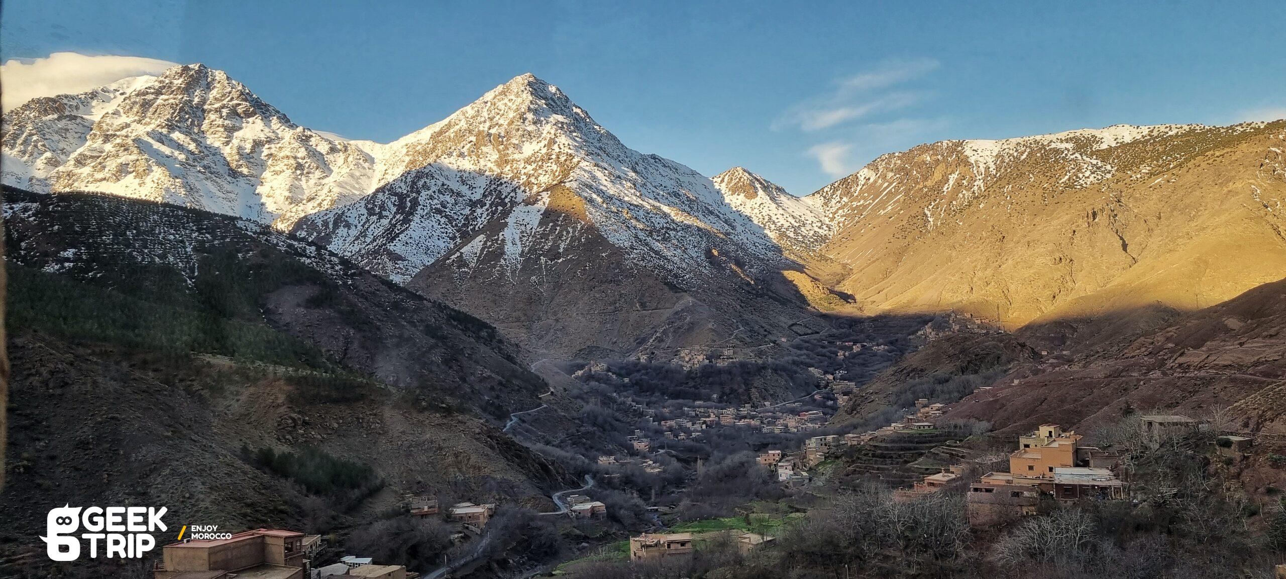 Le départ de la randonnée se fait depuis le village d’Imlil, situé dans la vallée de l’Atlas. Vous traverserez ensuite plusieurs petits villages berbères traditionnels tout en admirant les vues imprenables sur les montagnes environnantes. Au fil de la randonnée, vous verrez des champs en terrasse, des forêts de chênes et de noyers, ainsi que des ruisseaux cristallins.